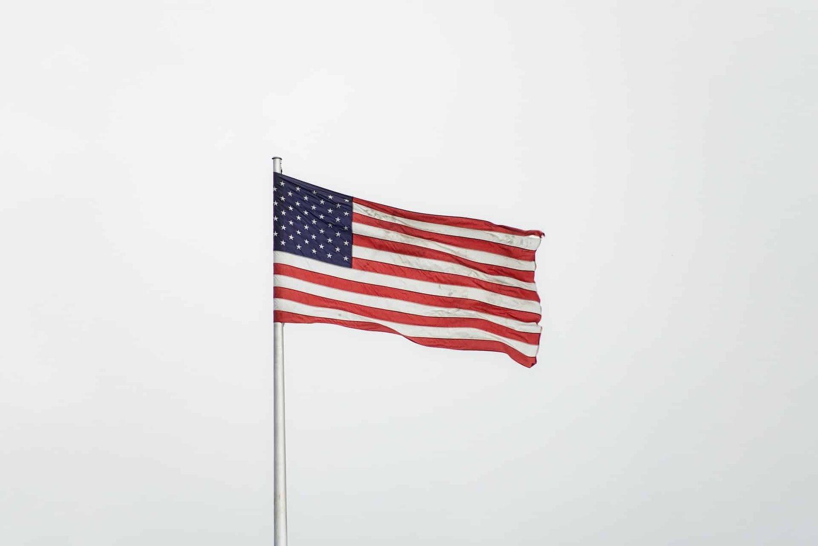 Bandeira dos Estados Unidos, grande, com listras vermelhas e brancas e estrelas brancas sobre um retângulo azul ao canto esquerdo, estendida por uma pessoa cujo braço é visto ao fundo